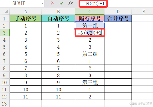 在C列第3行使用函数【N】,设置内容为【N(C2)+1】,再使用快捷键【Ctrl+Enter】即可填充,实现效果如下所示。