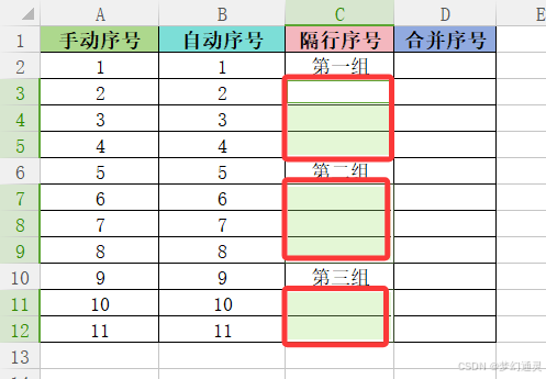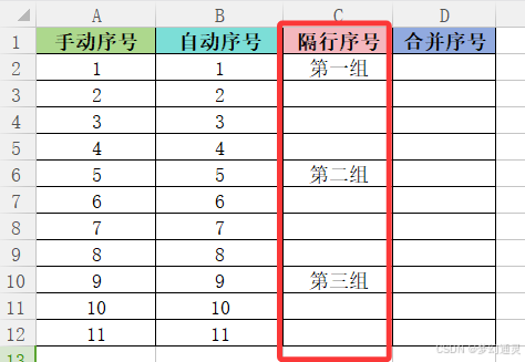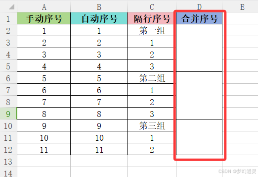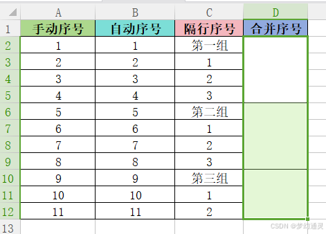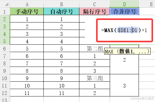 使用【MAX】函数,设置内容为【MAX(D11:D1)+1】,再使用快捷键【Ctrl+Enter】即可完成设置,实现效果如下所示。