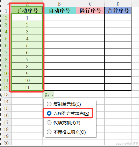 即输入第一行的值1,鼠标手动下拉,在右下角-选择【以序列方式填充】即可,如下图所示。
