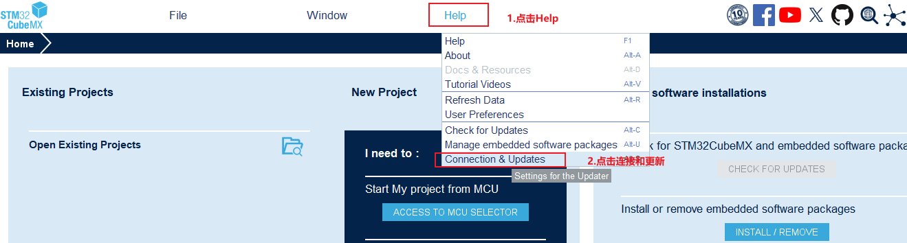 打开 CubeMX。点击菜单栏 Help -> Connect。