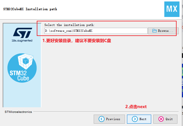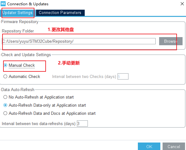 在 Repository Folder 里,选一个空间大的盘(固件库很大,一个系列约 1-2GB)。例如:D:/STM32Cube/Repository。