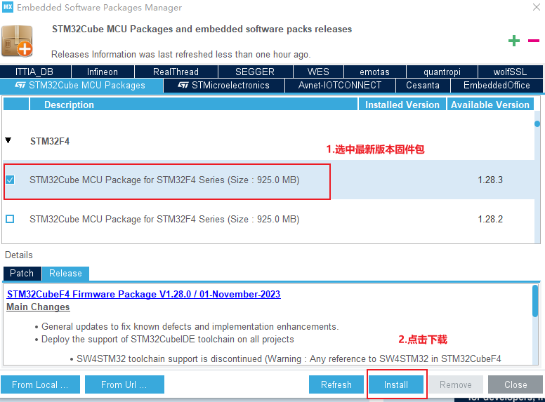 勾选最新的版本(如 STM32Cube FW_F4 V1.28.3),点击 Install Now。