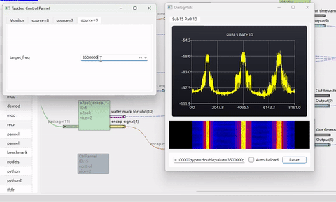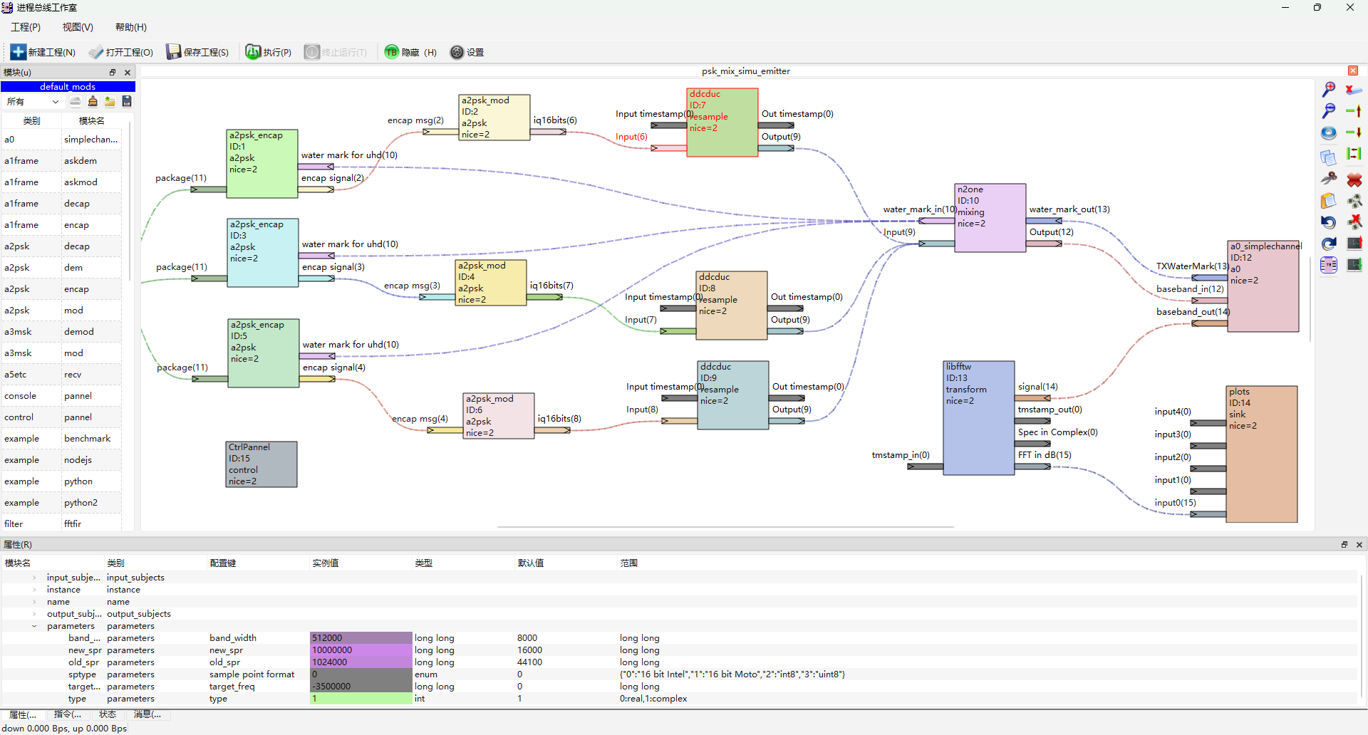 下面这个例子里,产生了3路不同速率的调相波形,并上采样到同一个采样率下,进行合路。通过调整移频因子,可以实时改变某个载波的位置。