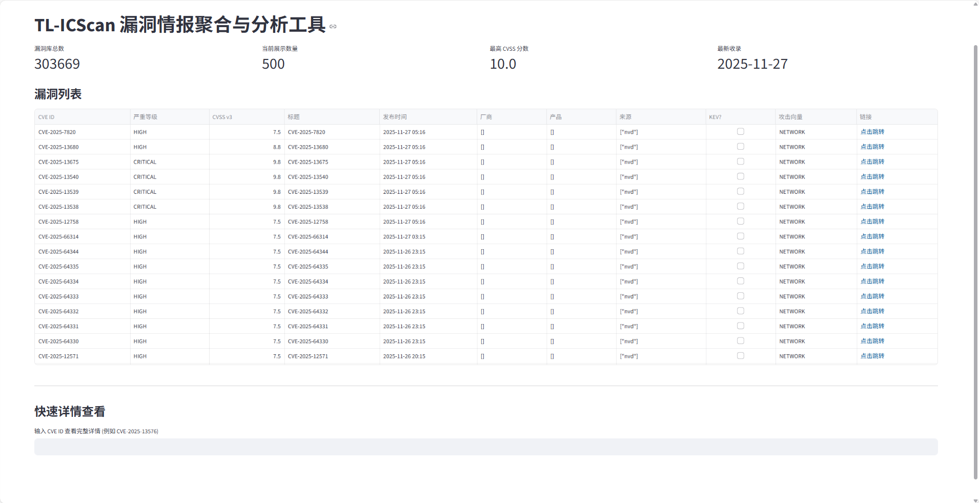 TL-ICScan 是一款面向安全研究人员、红队与蓝队的本地化漏洞情报聚合与分析工具。