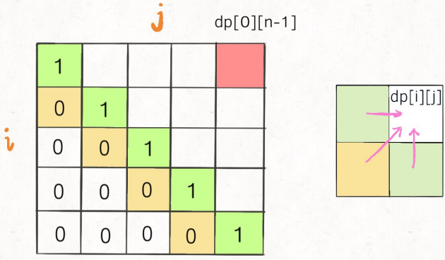 LeetCode516:最长回文子序列的dp数组如上图所示,其base case确定为中间对角线,最终答案是dp[0][n-1],通过状态转移方程可知,dp[i][j]由dp[i][j-1]、dp[i+1][j]、dp[i+1][j-1]转移而来。因此,dp数组采用斜向遍历或反向遍历均可: