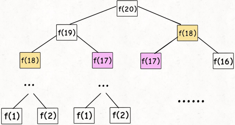 当计算原问题 f ( 20 ) f(20) f(20)时需先计算出子问题 f ( 19 ) 、 f ( 18 ) f(19)、f(18) f(19)、f(18),计算 f ( 19 ) f(19) f(19)时同理要计算出子问题 f ( 18 ) 、 f ( 17 ) f(18)、f(17) f(18)、f(17)。以此类推,最后计算到 f ( 2 ) 、 f ( 1 ) f(2)、f(1) f(2)、f(1)时结果已知即可直接返回结果,递归树也无需向下继续生长。递归算法的时间复杂度等于子问题个数乘以解决一个子问题所需的时间,该递归树树高为O(N)级别,因此节点总数为 O ( 2 n ) O(2^n) O(2n)级别,时间复杂度亦为 O ( 2 n ) O(2^n) O(2n)。
