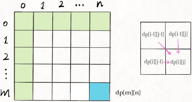 LeetCode72:编辑距离的dp数组如上图所示,其base case确定为dp[...][0](第0列)和dp[0][...](第0行),最终答案是dp[m][n],通过状态转移方程可知dp[i][j]由dp[i-1][j-1]、dp[i-1][j]、dp[i][j-1]转移而来。因此,dp数组应为正向遍历: