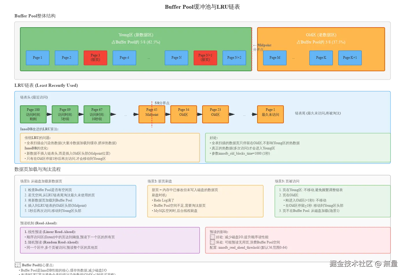 - Buffer Pool是性能核心: 缓存数据页和索引页,减少磁盘I/O,改进的LRU算法防止缓存污染