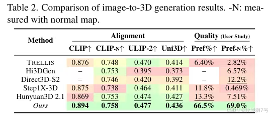 **(2)质量:**在 Toys4K 和 Sketchfab 等标准测试集上,TRELLIS.2 在网格距离(模型准不准)和视觉质量(看起来真不真)上,都超越了腾讯的 Hunyuan3D 2.1、Dora 等强力竞品。用户盲测中,近 70% 的人觉得 TRELLIS.2 的结果更好。
