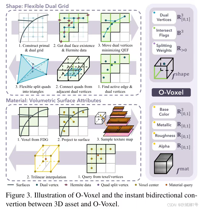 TRELLIS.2 发明了一种叫 **O-Voxel(全体素)**的新结构。你可以把它想象成一种超级进化的乐高积木。这种积木不仅记录了它在哪,还记录了它内部的精细结构。它采用了一种"双格点"设计,既保留了像素那样整齐排列的便利性(方便计算机计算),又拥有极高的灵活性。