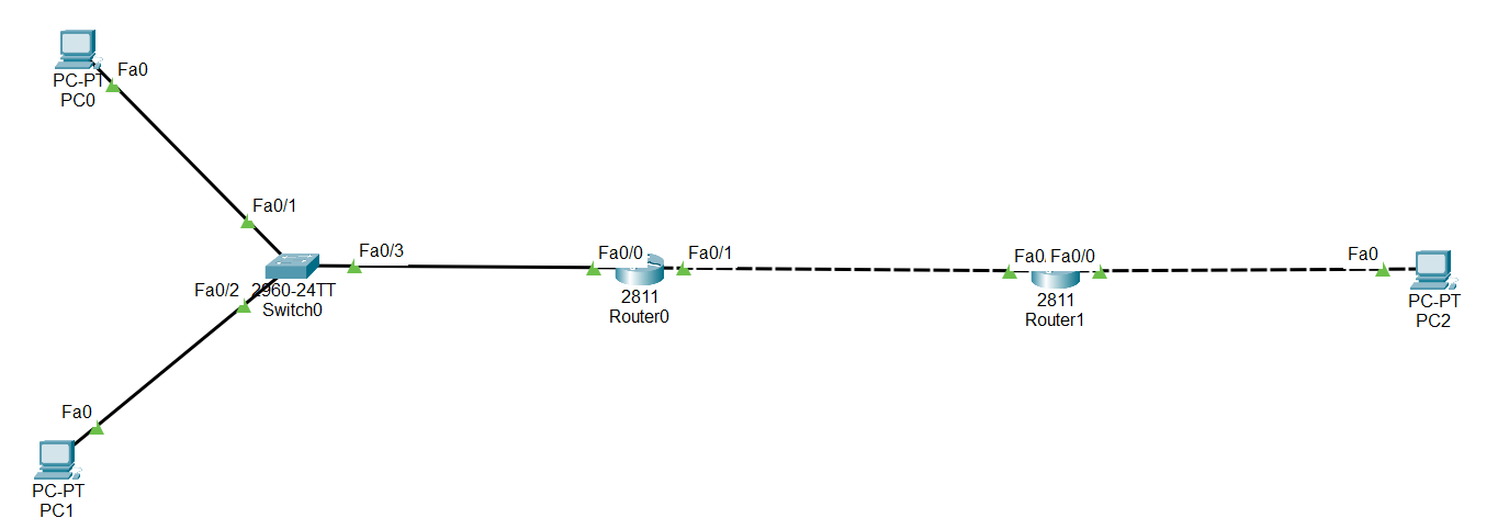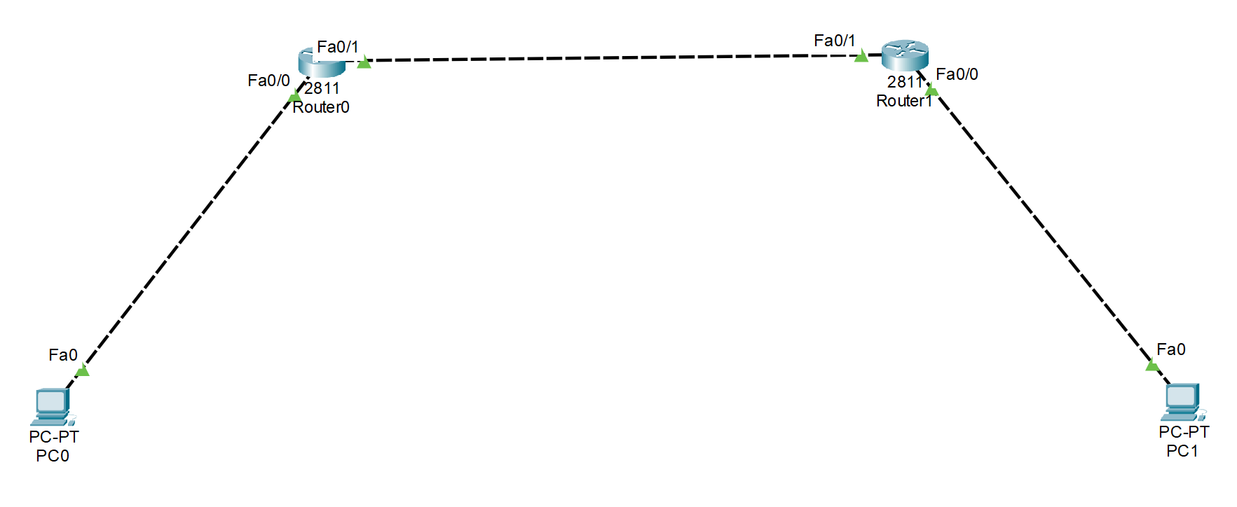//Router0 interface FastEthernet0/0 ip address 192.168.1.254 255.255.255.0 ! interface FastEthernet0/1 ip address 192.168.10.10 255.255.255.0 ! ip route 192.168.3.0 255.255.255.0 192.168.10.100 //Router1 interface FastEthernet0/0 ip address 192.168.3.254 255.255.255.0 ! interface FastEthernet0/1 ip address 192.168.10.100 255.255.255.0 ! ip route 192.168.1.0 255.255.255.0 192.168.10.10