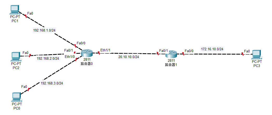 //Router0 interface FastEthernet0/0 ip address 192.168.1.254 255.255.255.0 ! interface FastEthernet0/1 ip address 192.168.2.254 255.255.255.0 ! interface Ethernet1/0 ip address 192.168.3.254 255.255.255.0 ! interface Ethernet1/1 ip address 20.10.10.10 255.255.255.0 ! ip route 0.0.0.0 0.0.0.0 20.10.10.100 //Router1 interface FastEthernet0/0 ip address 172.16.10.254 255.255.255.0 ! interface FastEthernet0/1 ip address 20.10.10.100 255.255.255.0 ! ip route 0.0.0.0 0.0.0.0 FastEthernet0/1