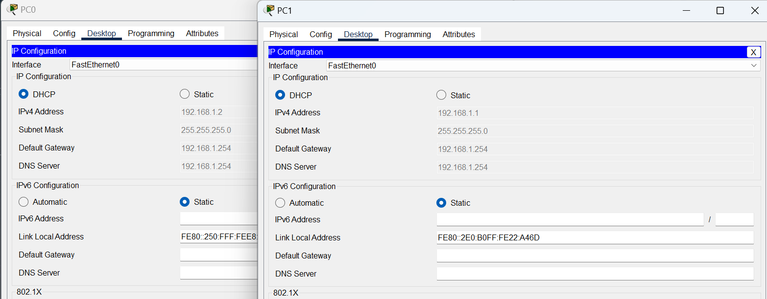 //Switch0 interface Vlan1 ip address 192.168.1.100 255.255.255.0 ! ip default-gateway 192.168.1.254 ! line vty 0 4 login local transport input telnet //Router0 ip dhcp pool 1 network 192.168.1.0 255.255.255.0 default-router 192.168.1.254 dns-server 192.168.1.254 ! interface FastEthernet0/0 ip address 192.168.1.254 255.255.255.0 ! interface FastEthernet0/1 ip address 10.10.10.10 255.255.255.0 ! ip route 172.16.20.0 255.255.255.0 10.10.10.100 //Router1 hostname R1 ! enable secret 5 $1$mERr$/Q/mbs3O9oHsKR7rNG4e81 ! username pc0 secret 5 $1$mERr$/Q/mbs3O9oHsKR7rNG4e81 username pc1 secret 5 $1$mERr$H7PDxl7VYMqaD3id4jJVK/ ! ip domain-name pc0andpc1 ! interface FastEthernet0/0 ip address 172.16.20.254 255.255.255.0 ! interface FastEthernet0/1 ip address 10.10.10.100 255.255.255.0 ! ip route 0.0.0.0 0.0.0.0 10.10.10.10 ! line vty 0 4 login local transport input ssh