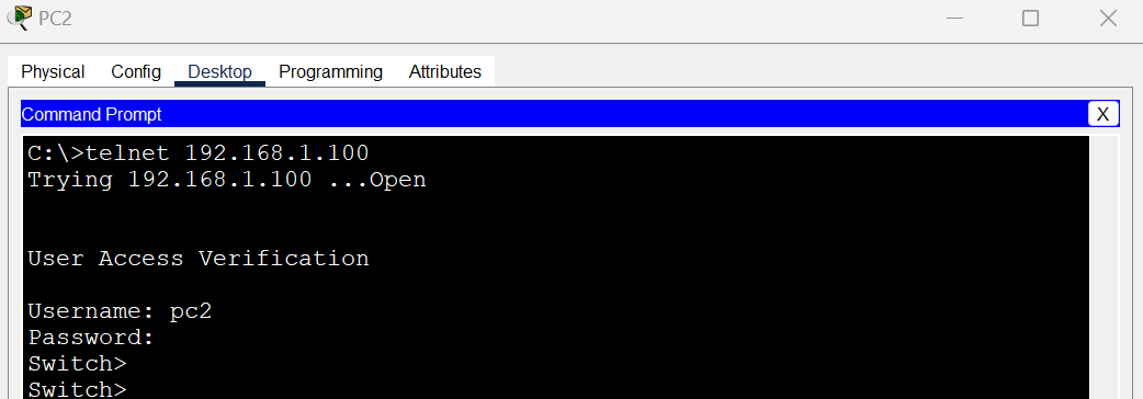 - 在交换机0上配置telnet,使 PC2 可以 telnet 管理交换机0