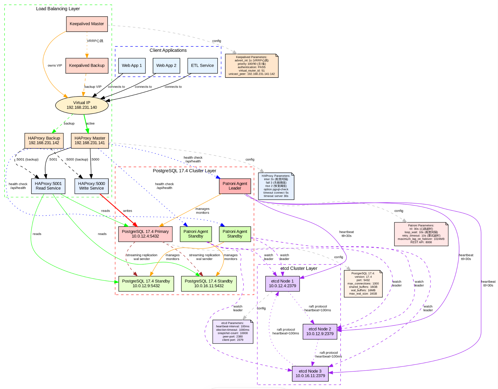 ETCD 是一种高度一致的分布式键值存储,提供了一种可靠的方式来存储需要被分布式系统或机器集群访问的数据。它能优雅地处理网络分区中的领导者选举,并且即使在领导者节点内也能容忍机器故障。存储PostgreSQL高可用集群的配置数据。它被Patroni用来管理集群状态,也被HAProxy和Keepalived用来确定当前哪个节点处于活跃状态。etcd确保配置数据在集群的所有节点上保持一致。