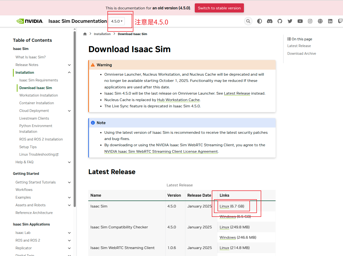 访问 NVIDIA 官方下载页面,选择 Isaac Sim 4.5.0 的 Linux 版本进行下载