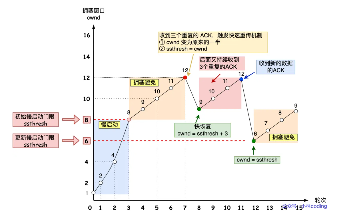 - 快重传:可以接收到多个ACK说明只有部分包丢失,网络轻度拥塞,为了提高网络带宽利用率,不能重新进入慢启动,而是将ssthresh置为当前拥塞窗口的一半,拥塞窗口/2,进入快速恢复