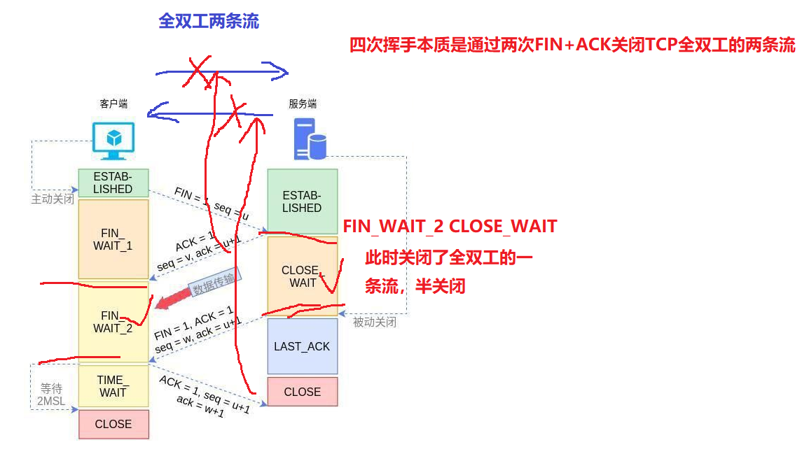 本质:TCP连接是全双工有两条流,四次挥手本质是通过两次FIN+ACK关闭TCP全双工的两条流