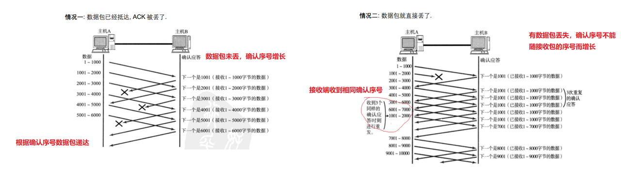 第二种收到重复的相同确认序号(只能增长到丢包的序号)