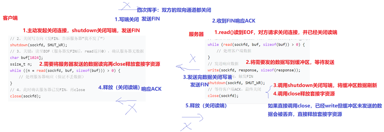 所以双方都是在合适时机先调用shutdown保证需要读或写的数据读完或写完,再调用close释放资源