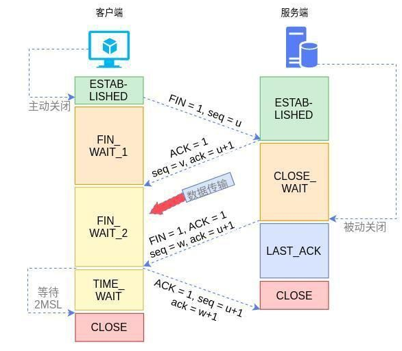 - 客户端接收到FIN后发送ACK应答,状态由FIN_WAIT_2变为TIME_WAIT,等待2个MSL后变为CLOSE状态,服务器接收到ACK后变为CLOSE状态,连接彻底关闭