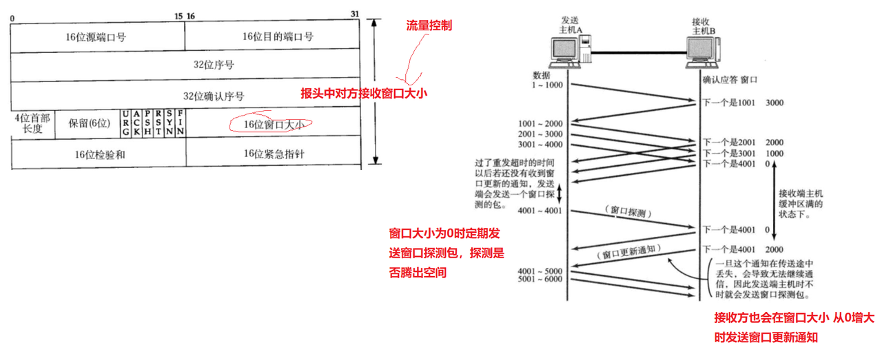 流量控制是根据对方报文中窗口大小进行发送数据速度控制,过大就增大速度,过小就降低速度,为0就停止,并定时发送窗口探测包,检测是否有空间产生,接收方也会在缓冲区有剩余空间时发送窗口更新包。