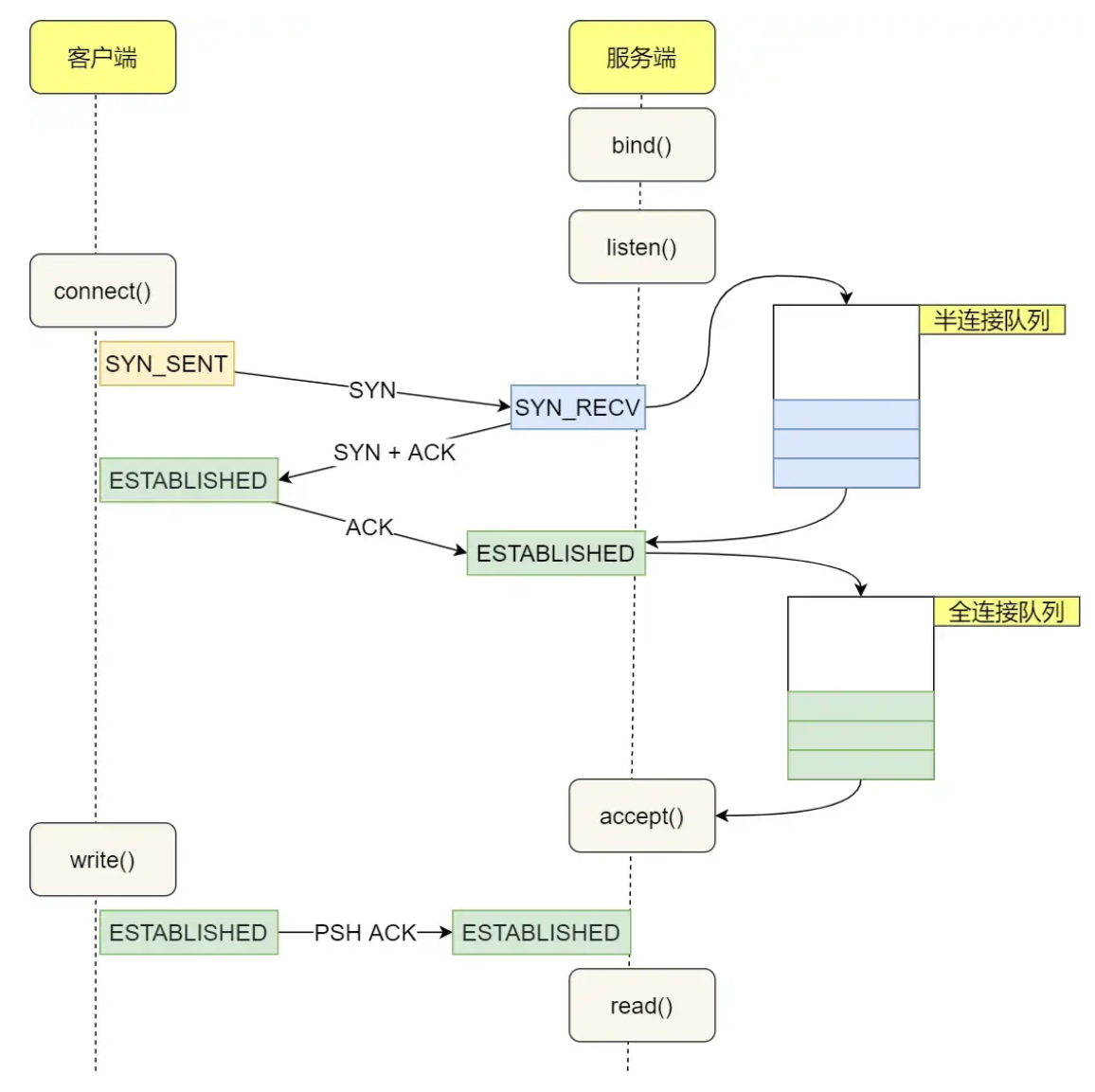在第二次握手时服务器会将暂未完成的连接放到半连接队列中,第三次握手完成后将其放到全连接队列 - accept是从全连接队列中获取已经创建好的连接