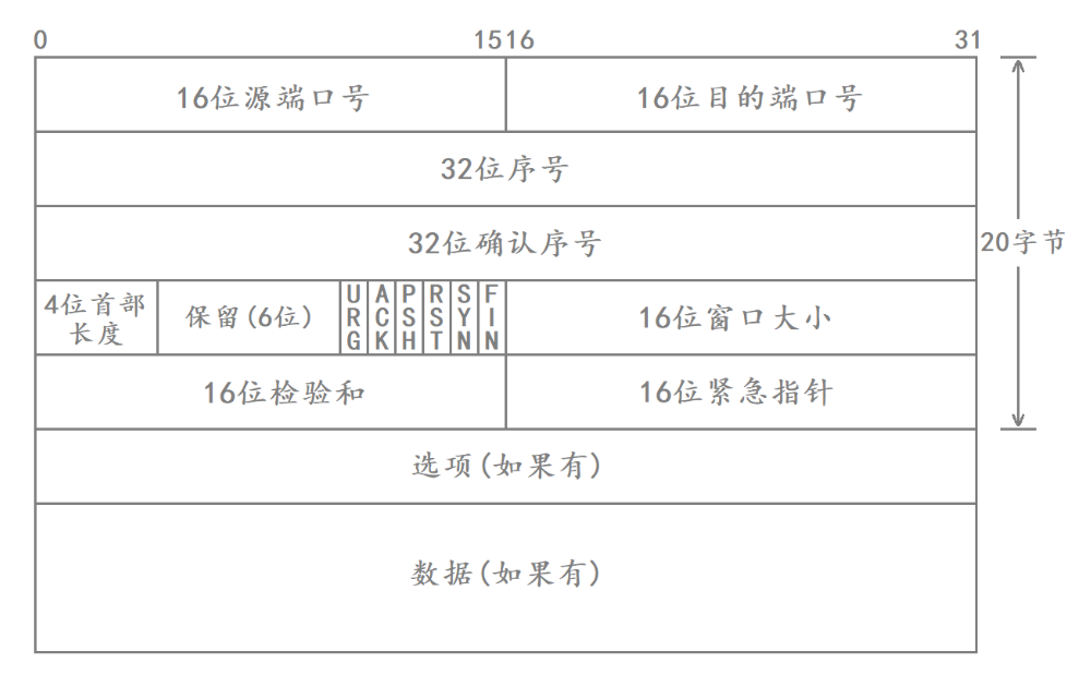 - 4位首部长度:标识TCP的报头长度包括选项,标识范围[5,16],单位4字节->[20,64]字节