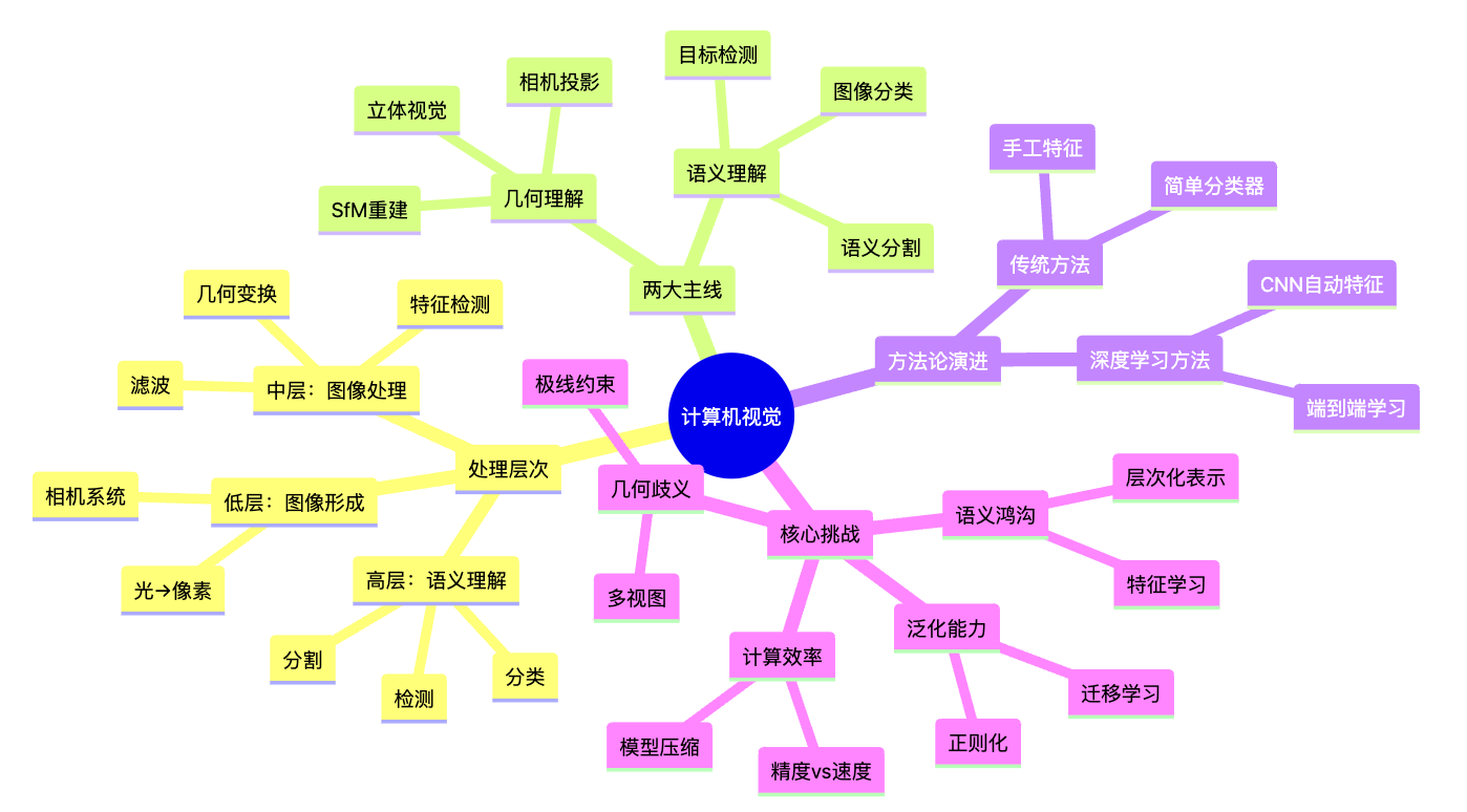 🎯 学习目标:理解计算机视觉的整体框架,掌握从低层图像处理到高层语义理解,从几何重建到语义识别的完整知识体系