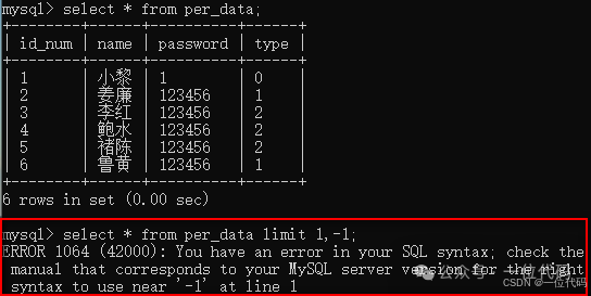 **错误提示原文:**ERROR 1064 (42000): You have an error in your SQL syntax; check the manual that corresponds to your MySQL server version for the right syntax to use near '-1' at line 1