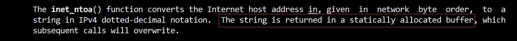 man 手册上说, inet_ntoa 函数, 是把这个返回结果放到了静态存储区. 这个时候不需要我们手动进行释放.