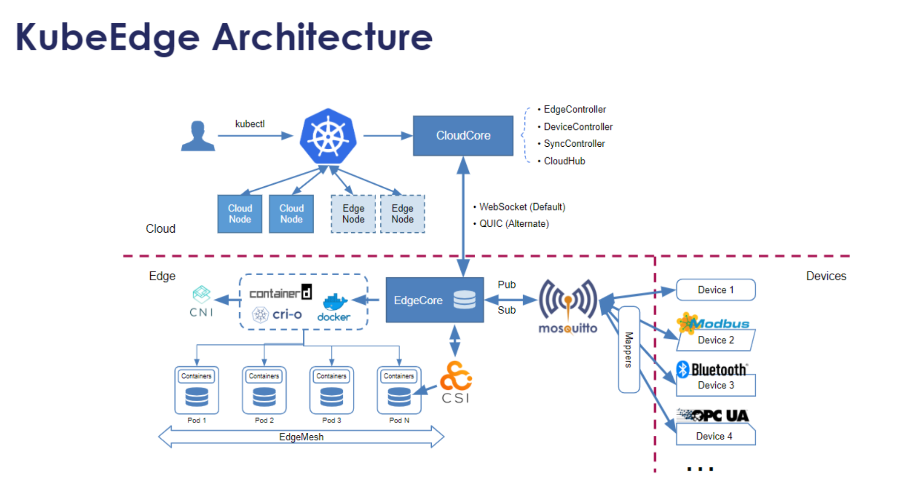 - EdgeCore:边缘侧组件,负责在边缘节点运行应用