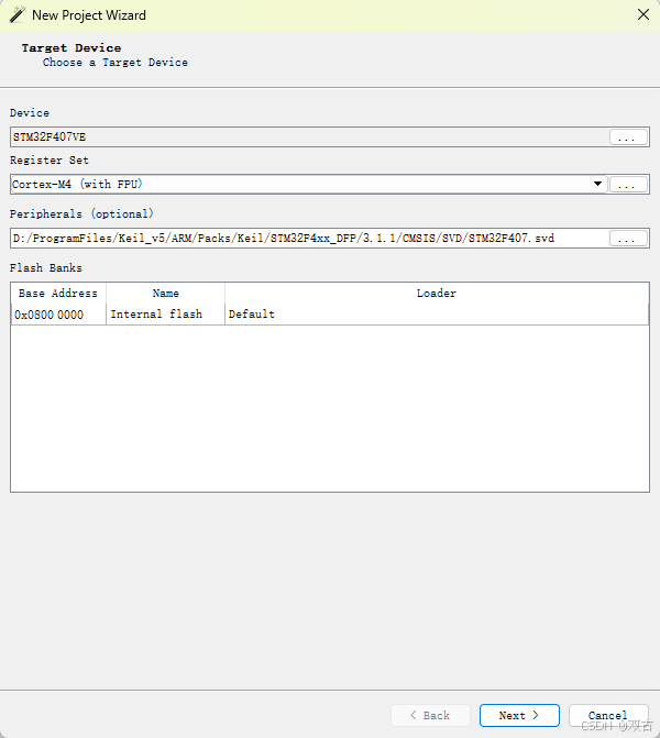 网上太多,不赘述。只说一个,一定要记得选外设信息的svd文件,看寄存器很方便。SVD文件一般在DFP里面,具体的参考我图中的路径。