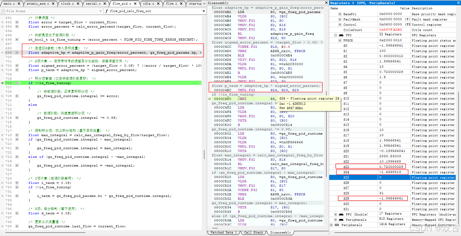 但Ozone可以从汇编中查看,如下图。在Disassembly窗口中,将鼠标放在该变量对应的寄存器时,会在鼠标附近显示该寄存器的值。我这里的adaptive_kp就存在S24寄存器里,可以在寄存器窗口通过对应的寄存器也能看到。