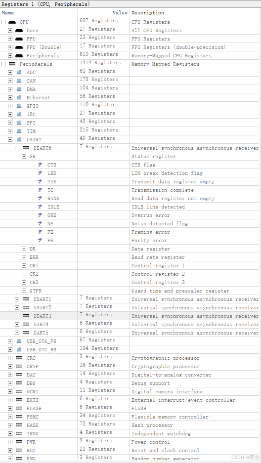 View->Registers中打开,具体内容如下图。很明显,描述信息比MDK详细很多。