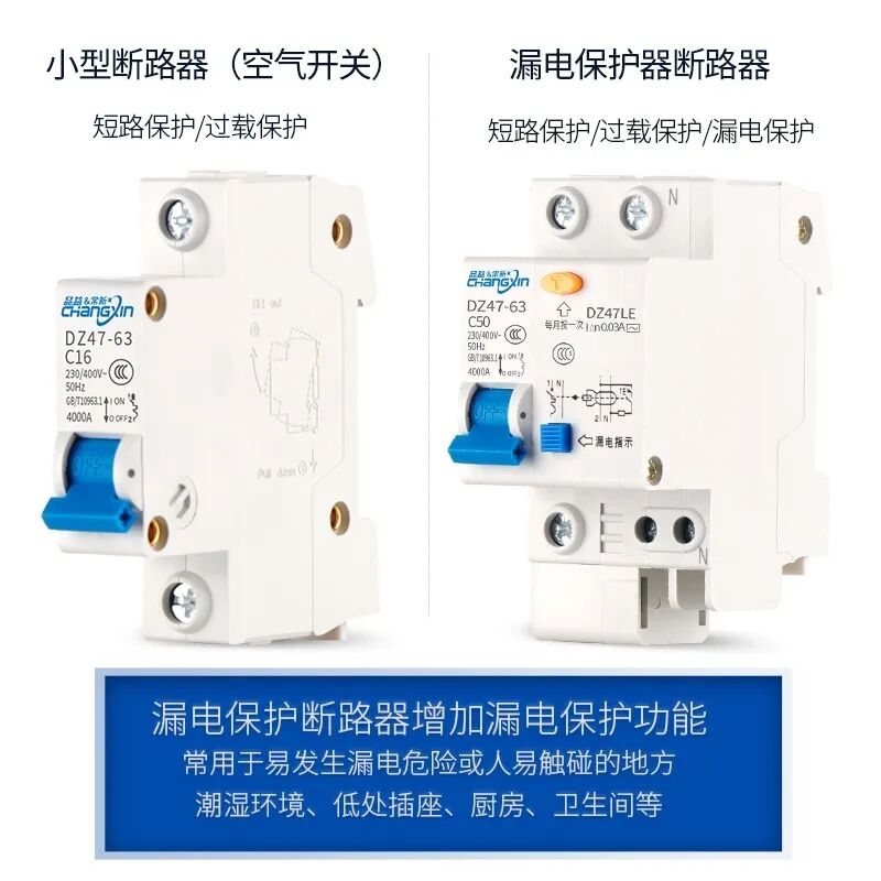 3.漏电保护器的尺寸比空气开关要大,且价格也比空气开关贵。漏电保护器上还有个测试按钮,建议每个月按一下,可测试漏电跳闸功能是否完好。