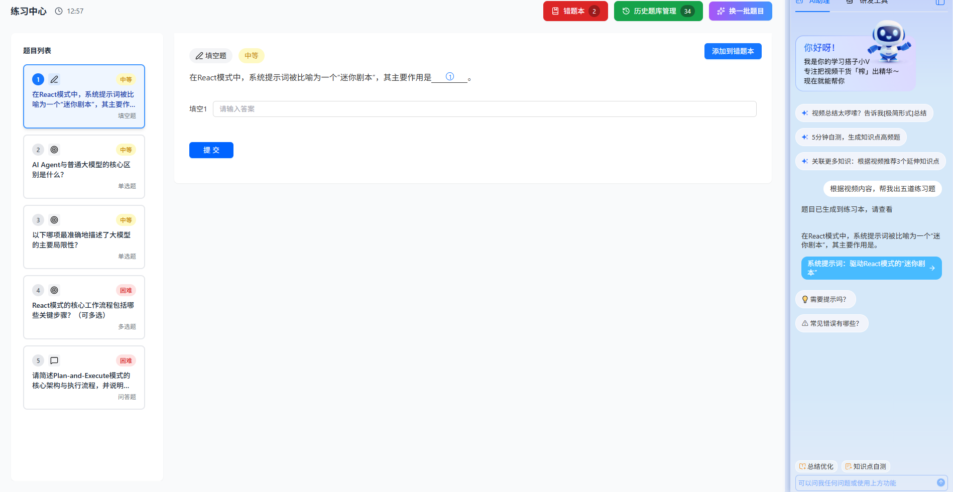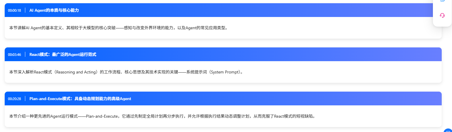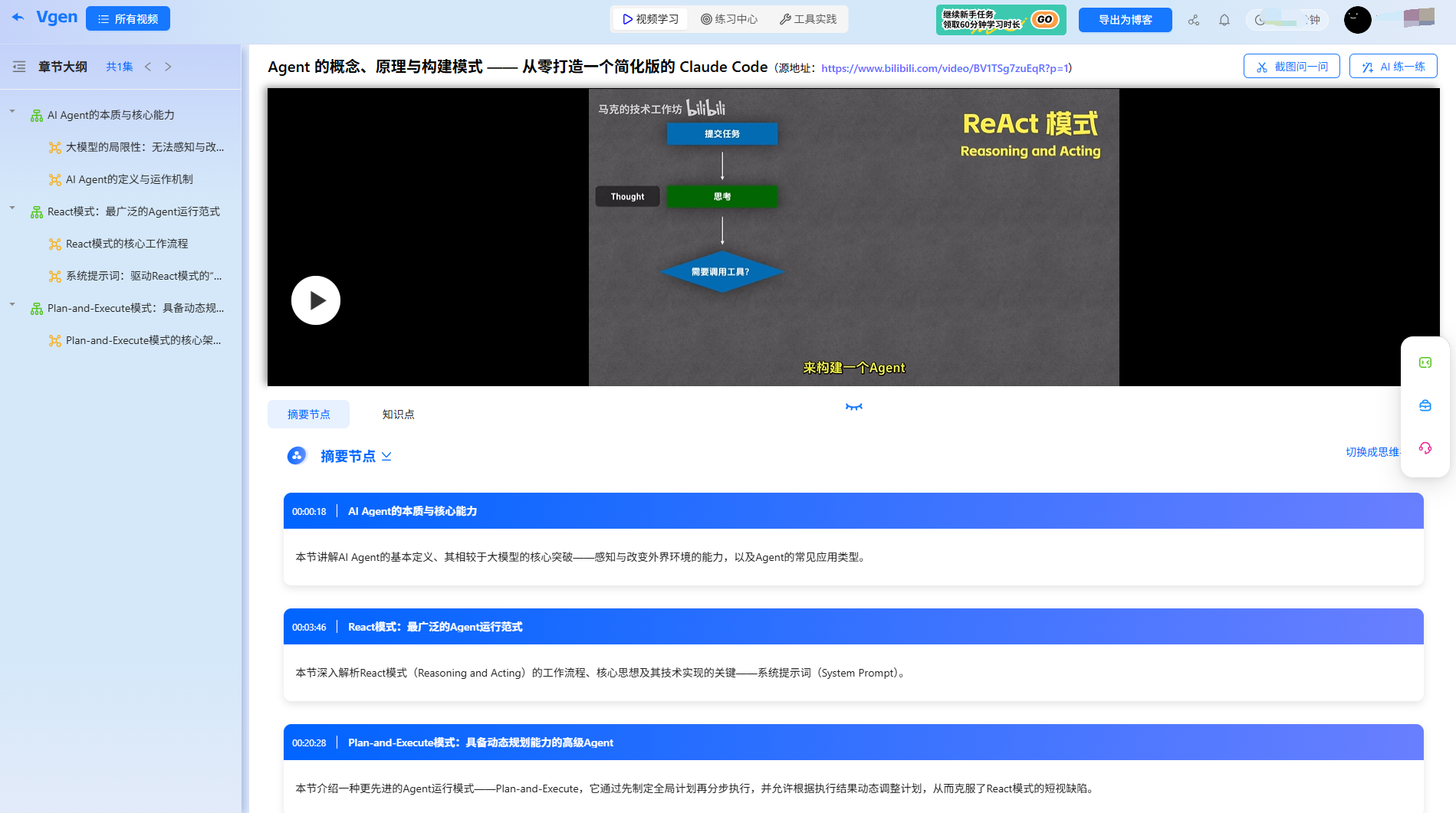 视频里React模式的代码快且碎,AI助理把它拆成"核心逻辑→执行步骤→代码模块"三部分,还用"流程图+关键代码注释"帮我理解"思考-行动-观察"的闭环本质,解决了我"抄代码不懂逻辑"的问题。