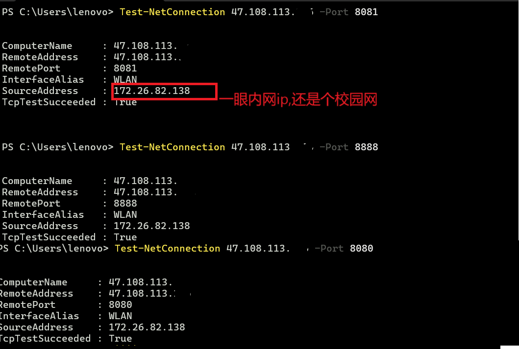 PS C:\Users\lenovo> Test-NetConnection 47.108.113.176 -Port 8082