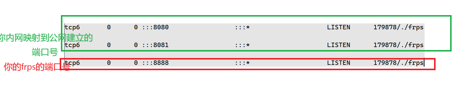 如果我们内网修改frpc.toml文件,增加更多的服务,映射到云服务器上不同的端口,就会在云服务器开放一个端口来帮助我们建立公网->内网的端口映射!