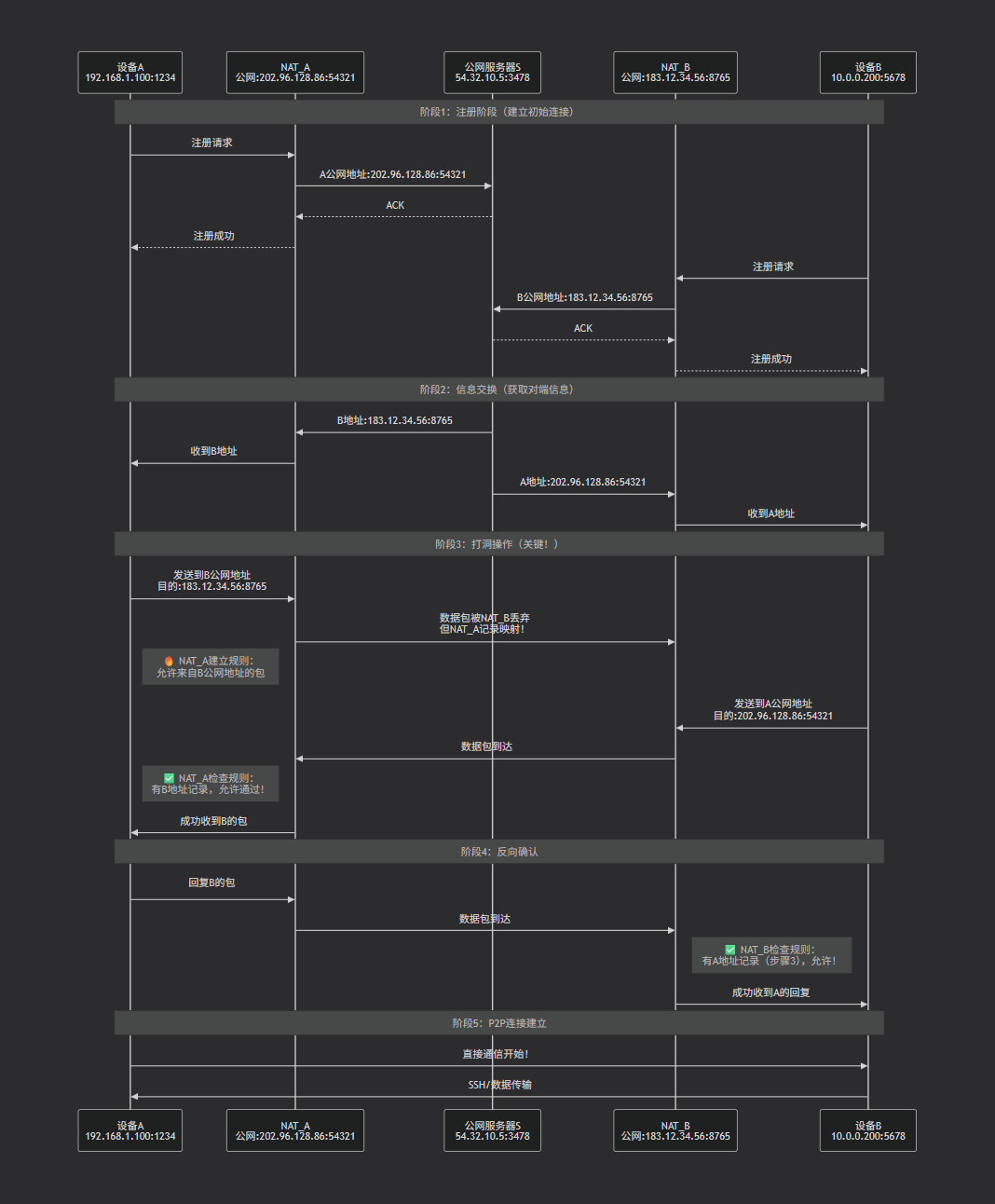整个过程的核心是:通过主动告知自己的保安"我要去对方那里",从而让保安记住对方的地址,允许对方未来回访。这就是内网打洞的本质------不是强行破墙,而是主动开门。