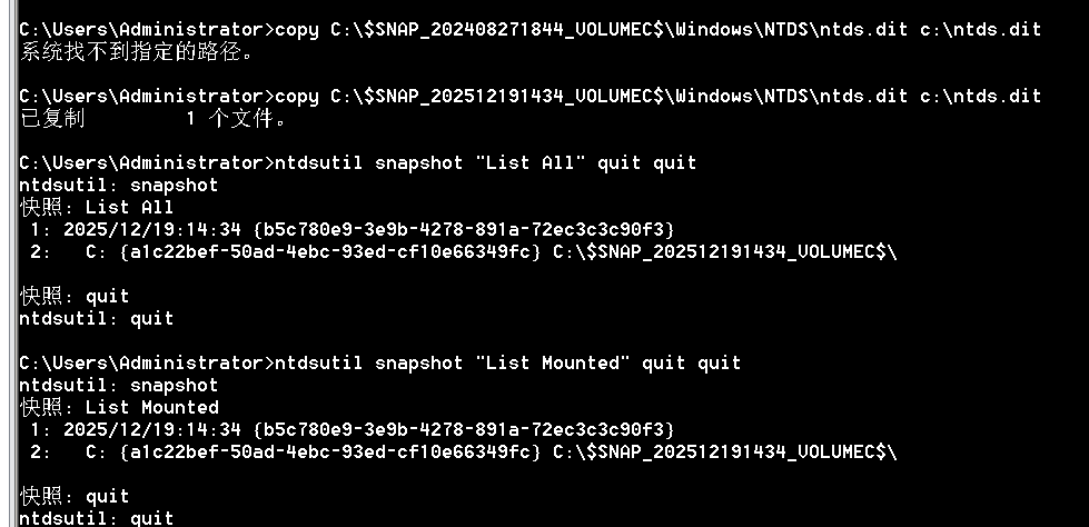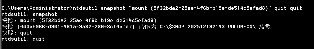 ntdsutil snapshot "List Mounted" quit quit --列出所有已挂载快照