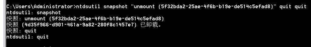 ntdsutil snapshot "unmount {5f32bda2-25ae-4f6b-b19e-de514c5efad8}" quit quit