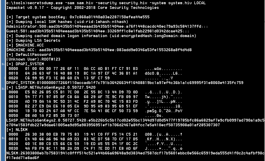 secretsdump.exe -sam sam.hiv -security security.hiv -system system.hiv LOCAL
