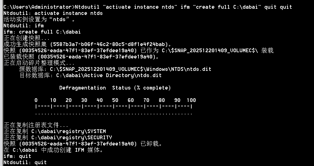 Ntdsutil "activate instance ntds" ifm "create full C:\dabai" quit quit