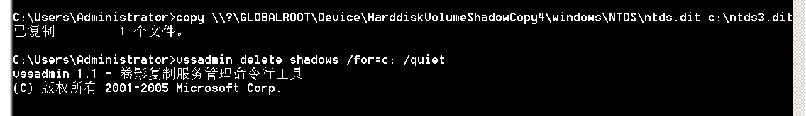 copy \\?\GLOBALROOT\Device\HarddiskVolumeShadowCopy4\windows\NTDS\ntds.dit c:\ntds3.dit