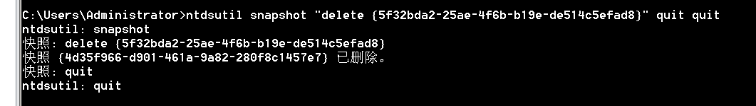 ntdsutil snapshot "delete {5f32bda2-25ae-4f6b-b19e-de514c5efad8}" quit quit