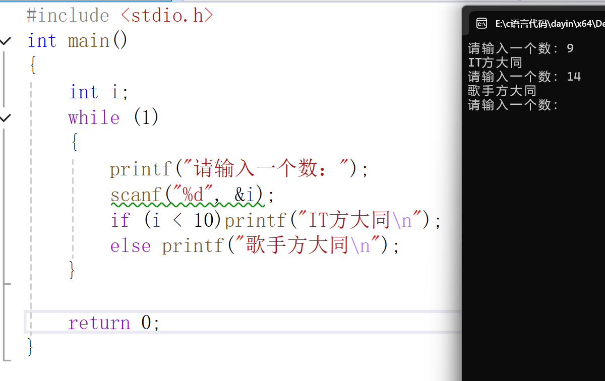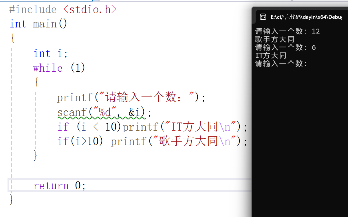 代码意思为输入一个数字,如果小于10输出 "IT方大同 ",大于10 输出" 歌手方大同"